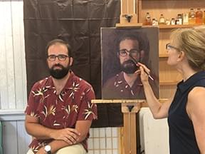 The ideal procedure entails an initial sitting with the subject for about 2-3 hours, as I create oil studies and color sketches for reference. The sitting also allows me to live with my subject for a bit and get familiar with their distinctive expressions and gestures as we explore choices for the final pose. During the session, I will take a series of photographs. Afterward, I'll take the images into Photoshop and make various compositions for the client to choose from. On approval of the composition, I will begin the painting. Most paintings take from four months to a year, depending on the size and complexity of the artwork.